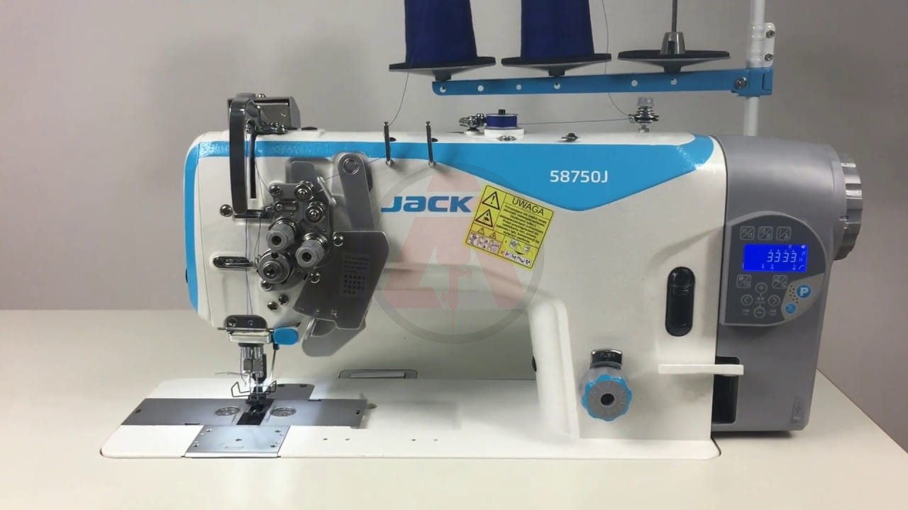 Jack JK-58750J to stebnówka dwuigłowa wyposażona w silnik Direct Drive zamontowany bezpośrednio na wale głównym maszyny. Maszyna posiada zamkniętą miskę olejową oraz czytelny i intuicyjny panel sterowania maszyną. Maszyna posiada możliwość wyłączania igły dzięki czemu możliwe jest szycie idealnych kątów prostych. Maszyna wyposażona jest w duże chwytacze